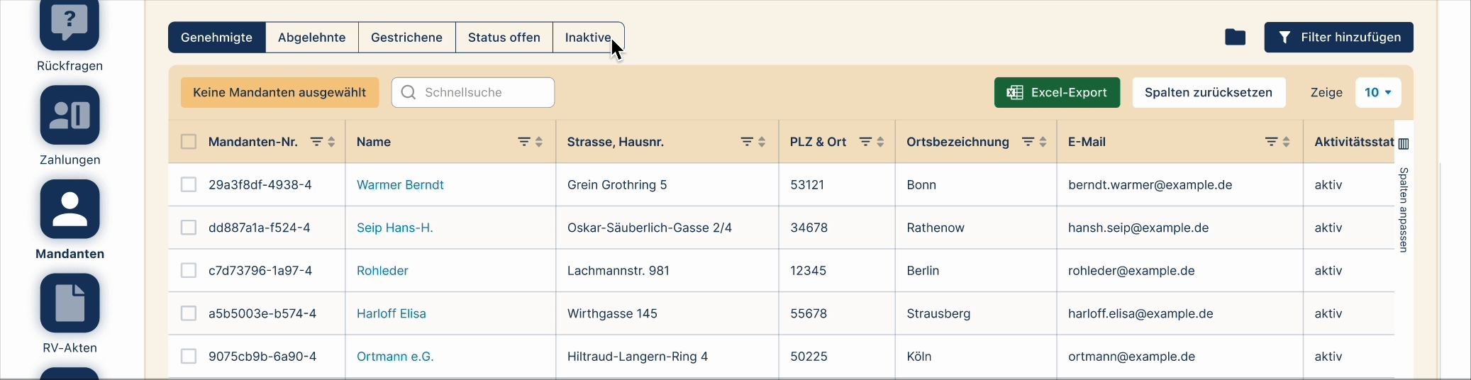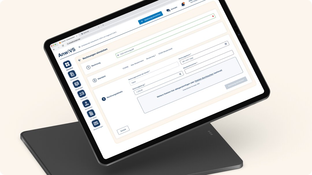 – Schnellzugriff auf wichtige Funktionen der jeweils aufgerufen Seiten permanent in der oberen Navigationsleiste (Aktionen: Rechnung einreichen, Mandant hinzufügen unter Menüpunkt Mandanten und Nachricht an uns unter Menüpunkt Rückfragen)