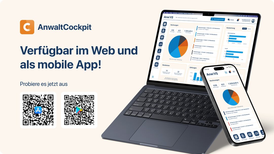 Laden Sie sich das AnwaltCockpit auch direkt auf Ihr Smartphone aus Ihrem bevorzugten App Store herunter und genießen Sie jederzeit und überall einfachen Zugriff auf Ihre Daten, Echtzeit-Benachrichtigungen und eine mühelose Verwaltung Ihrer Honorare.